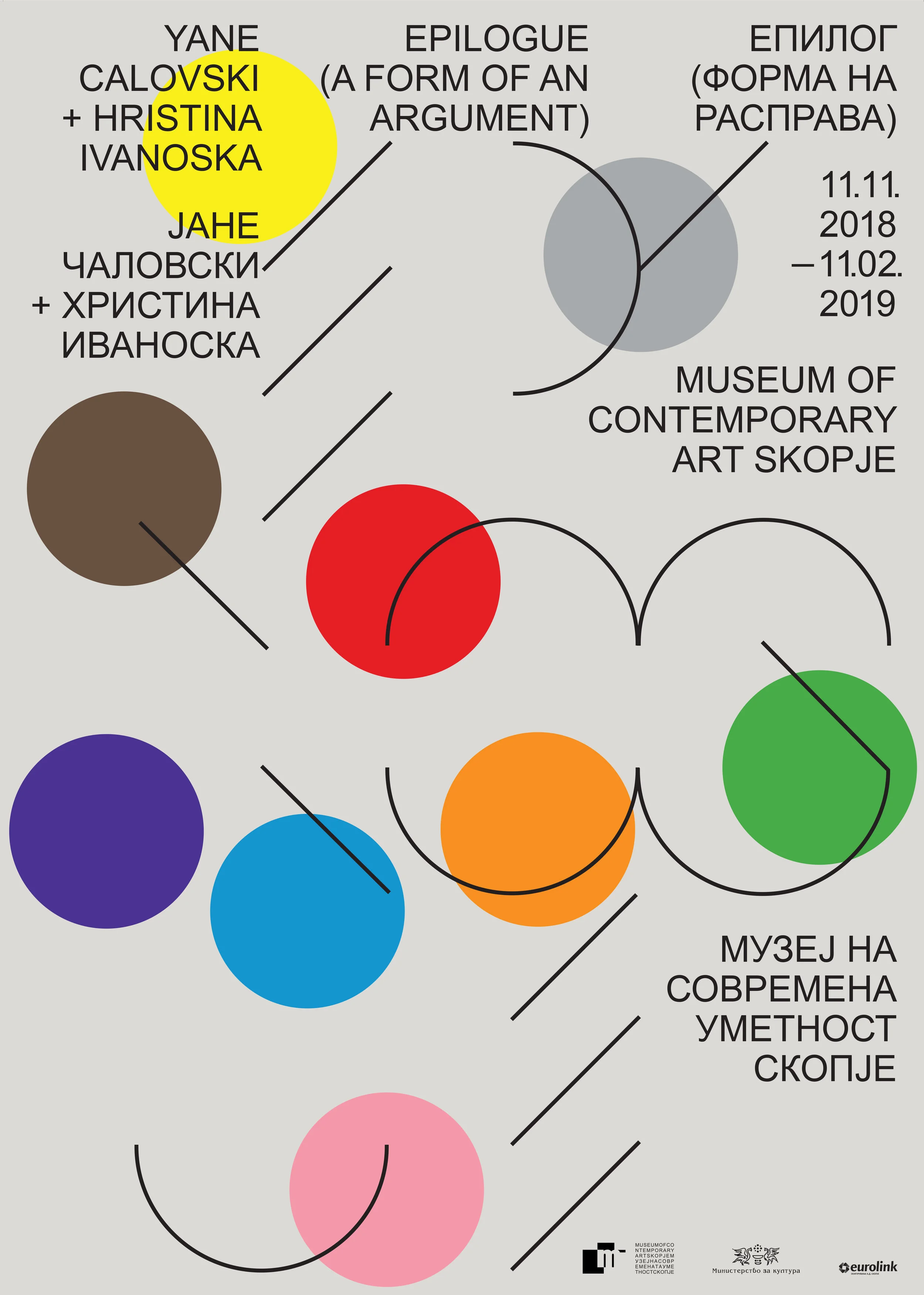 Poster for the exhibition „Epilogue (Form Of An Argument) by Macedonian artists Yane Calovski and Hristina Ivanoska at the Museum for Contemporary Art Skopje, November 2018